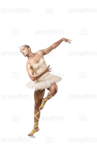Танцор балета в женской пачке нка белом фоне
