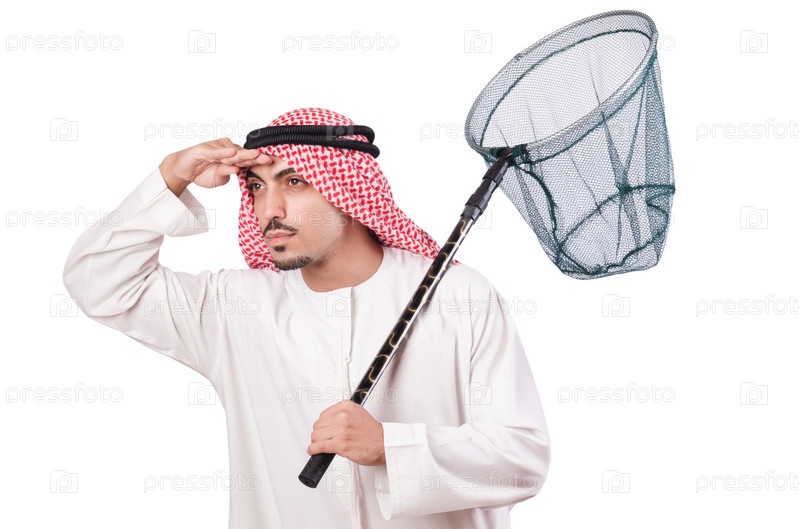 Арабский бизнесмен с сачком на белом