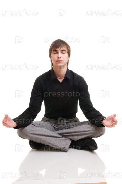 Молодой предприниматель занимается йогой на белом фоне