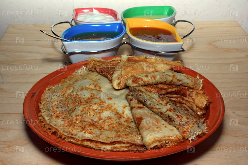 Блины со сметаной, сгущенкой, медом и вареньем стоят на столе