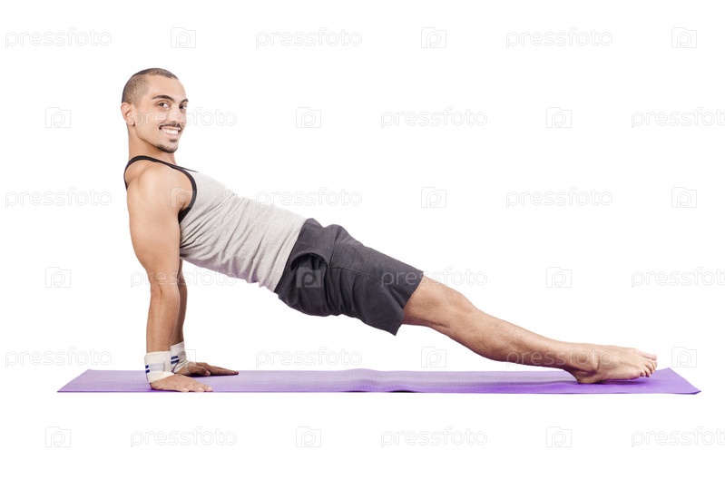 Мужчина делает упражнения на белом фоне
