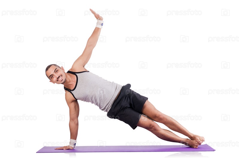 Мужчина делает упражнения на белом фоне