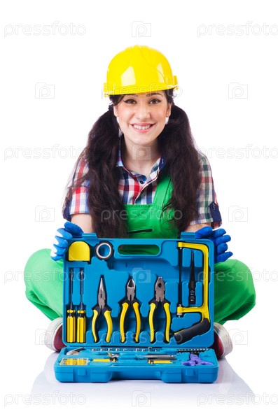 Женщина-строитель, изолированная на белом фоне