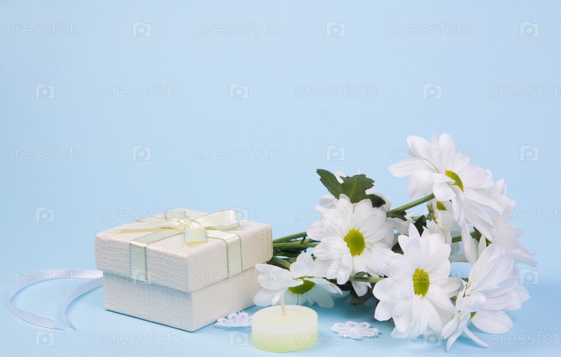 Букет белых хризантем и подарок