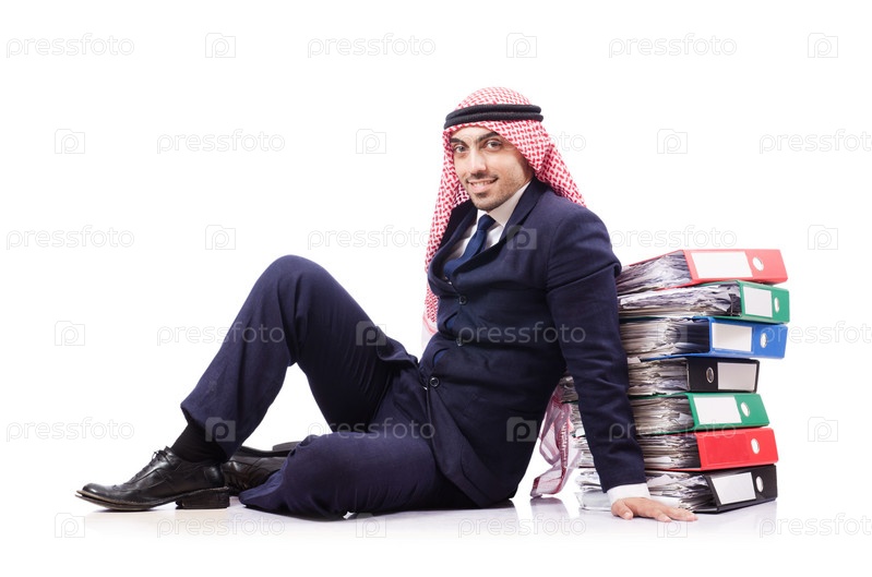 Арабский бизнесмен с множеством папок на белом фоне