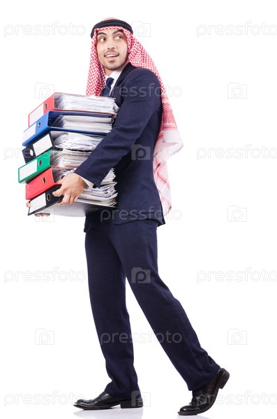 Арабский бизнесмен с множеством папок на белом фоне