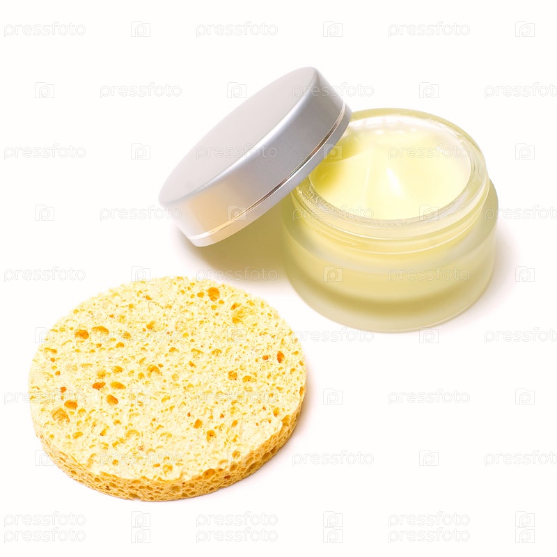 Крем для лица и губка на белом фоне