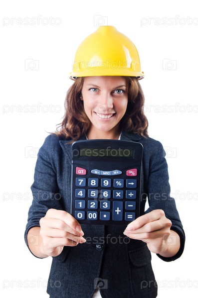 Женщина-строитель с калькулятором на белом фоне