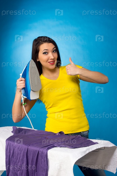 Домохозяйка с утюгом и одеждой для глаженья