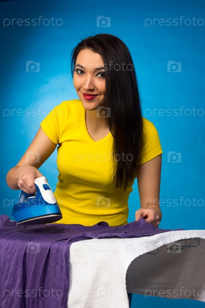 Домохозяйка с утюгом и одеждой для глаженья