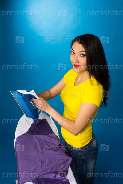 Домохозяйка с утюгом и одеждой для глаженья