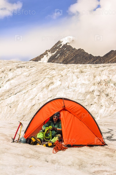 Альпинист готовит спортивное снаряжение на соревнованиях