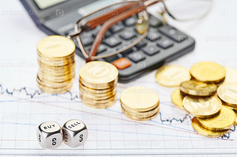 Стопки монет, калькулятор, очки и кубики со словами "продать" и "купить" на финансовых графиках