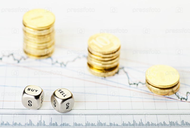 Стопки монет и кубики со словами "продать" и "купить" на финансовых графиках