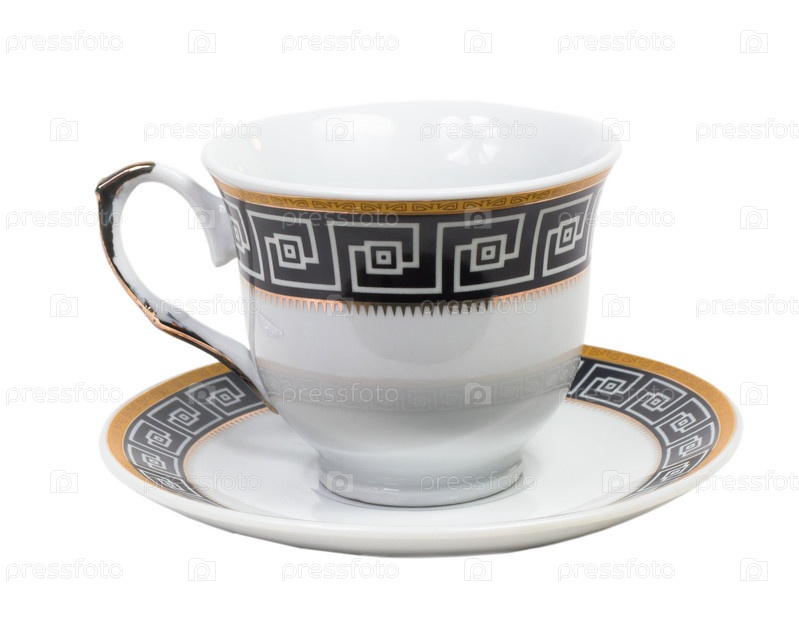 Английские украшенные старинные чайные чашка и блюдце, изолированные на белом фоне с путем отсечения