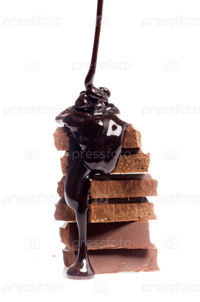 Плавленный шоколад стекает по кусочкам шоколада