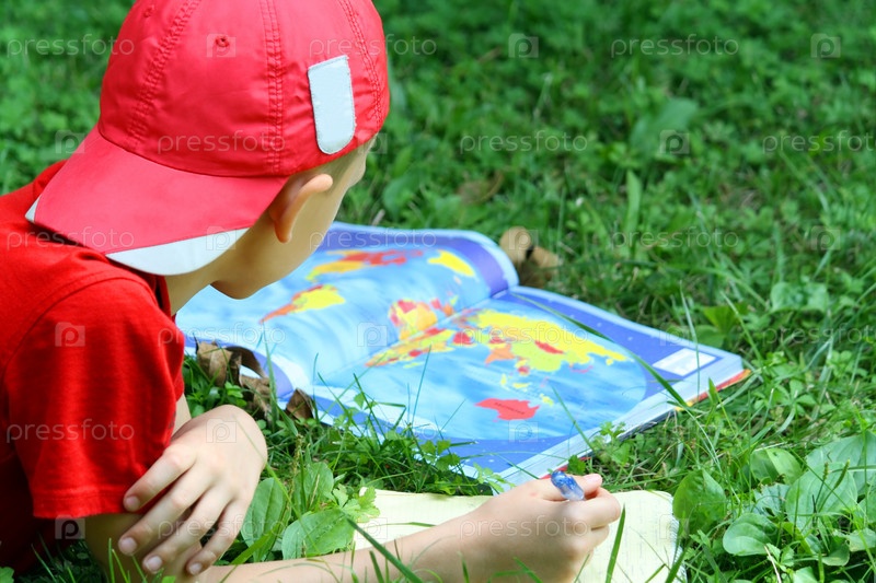 Мальчик изучает карту лежа на траве