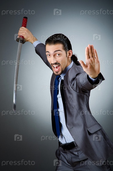 Сердитый бизнесмен с мечом в темной комнате