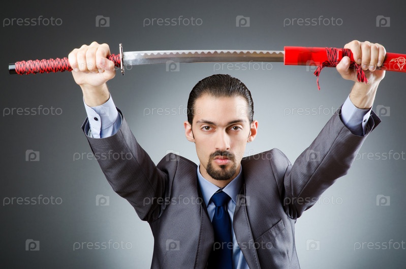 Сердитый бизнесмен с мечом в темной комнате