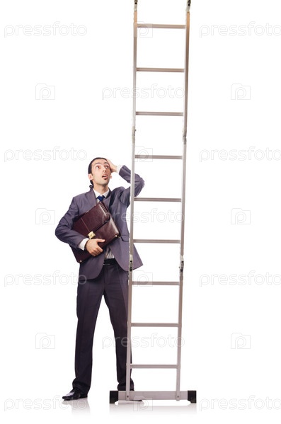 Бизнесмен поднимается по лестнице, изолированный на белом