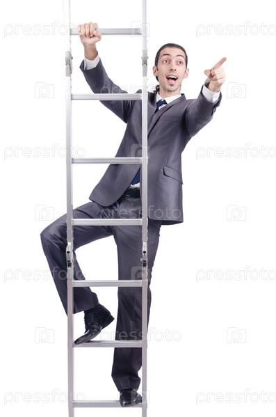 Бизнесмен поднимается по лестнице, изолированный на белом