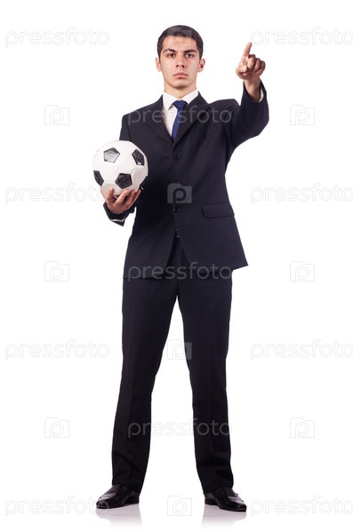 Молодой предприниматель с футбольным мячом на белом