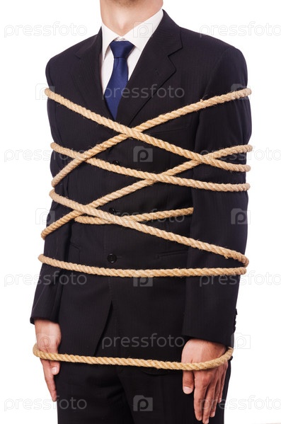 Бизнесмен, связанный веревкой, на белом