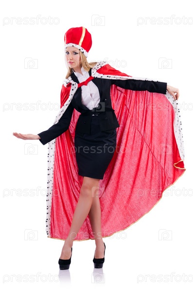 Бизнес-леди в костюме королевы, изолированная на белом