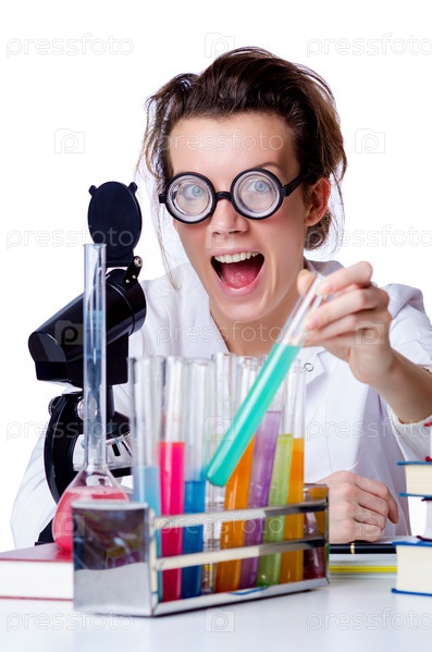 Сумасшедшая девушка химик в лаборатории