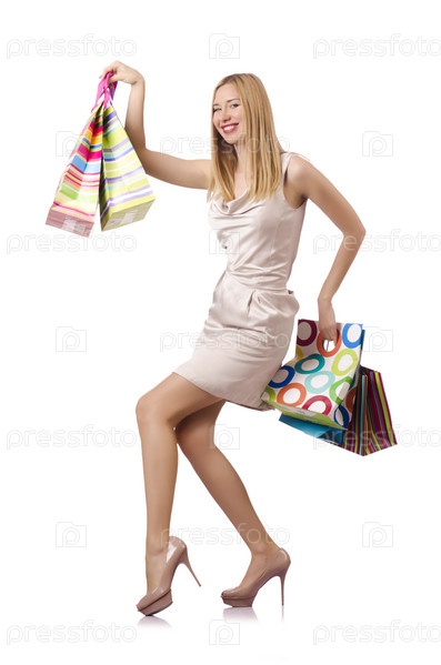 Высокая девушка после удачных покупок на белом