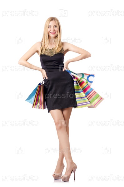 Высокая девушка после удачных покупок на белом