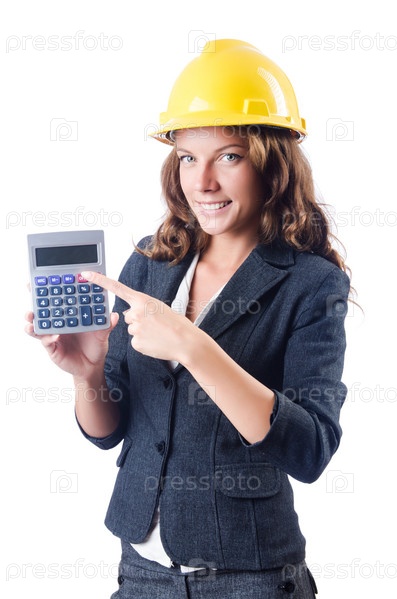 Женщина-строитель с калькулятором на белом фоне