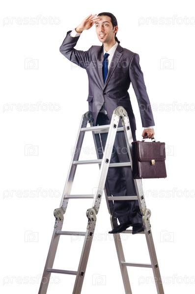 Бизнесмен на лестнице карьеры на белом