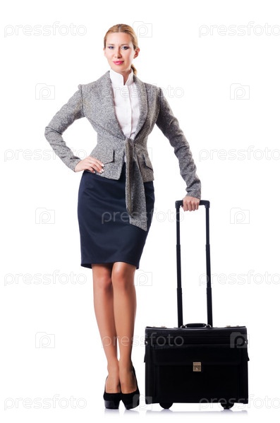 Бизнес-леди с чемоданом на белом фоне