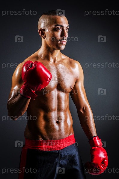 Боксер с красными перчатками в темной комнате
