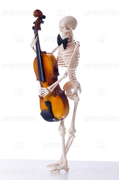 Скелет играет на скрипке, изолированный на белом