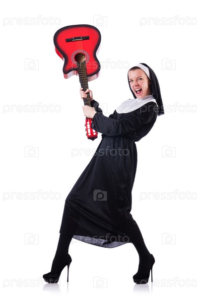 Монахиня играет на гитаре, изолированная на белом фоне