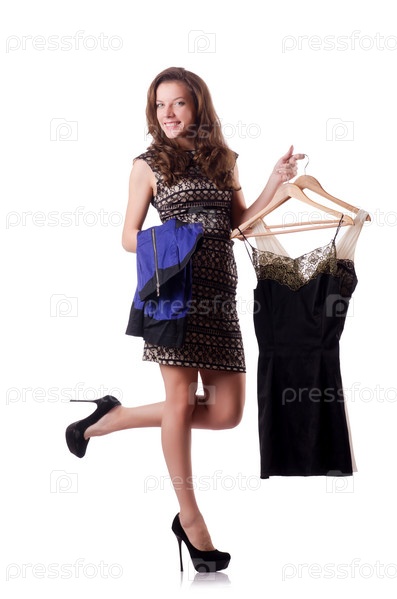 Молодая женщина меряет новую одежду на белом фоне