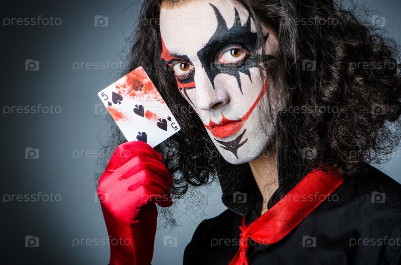 Злой клоун с картами в темной комнате