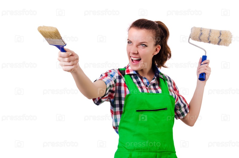 Маляр с кистью на белом фоне