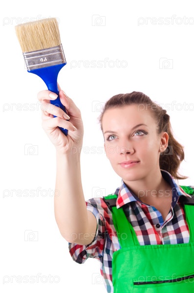 Маляр с кистью на белом фоне