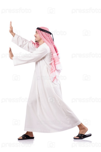 Бизнесмен-араб упирается в вооброжаемое препятствие