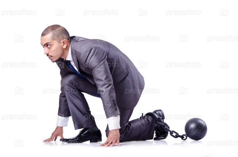 Бизнесмен на старте в кандалах на белом фоне