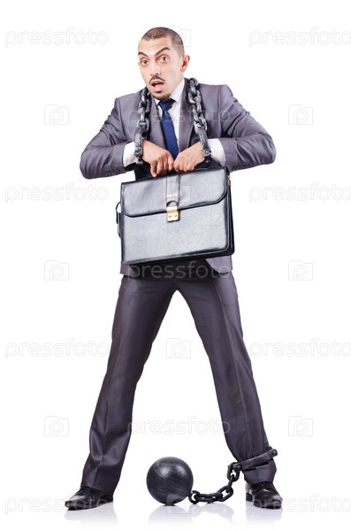 Бизнесмен в кандалах на белом фоне