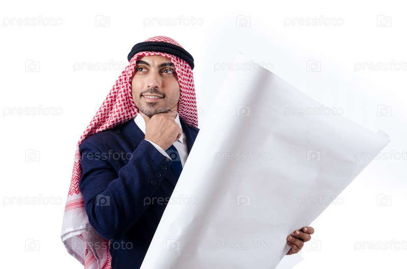 Арабский инженер с чертежами на белом фоне