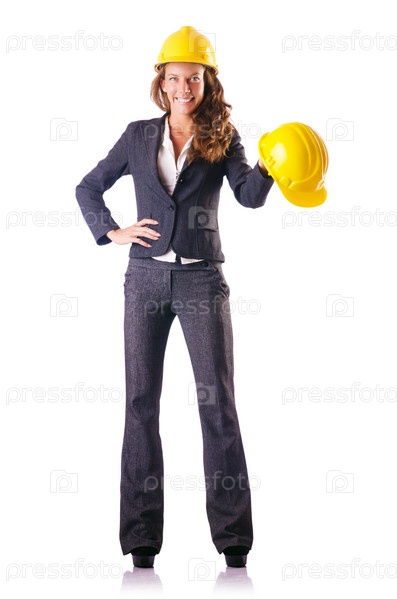Женщина-строитель в каске на белом фоне