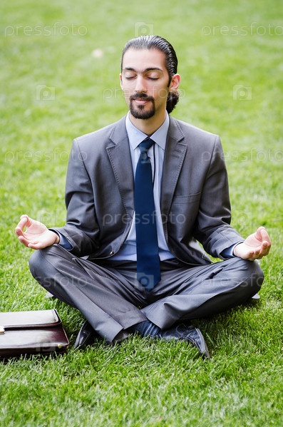 Молодой предприниматель медитирует в саду