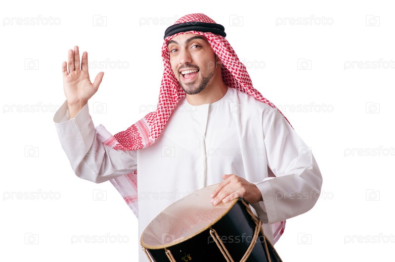 Араб играет на барабане, изолированный на белом фоне
