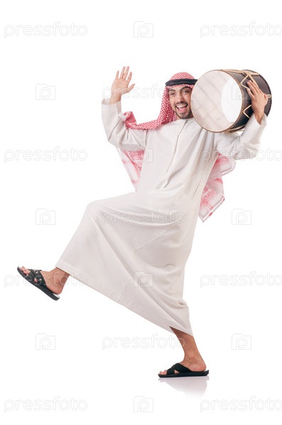 Арабский мужчина играет на барабане на белом