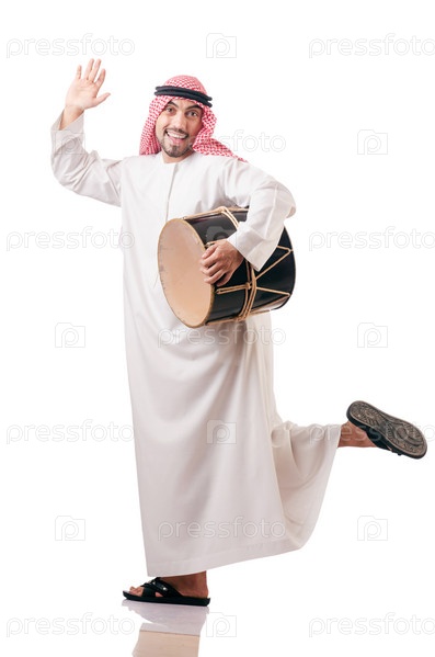 Арабский мужчина играет на барабане на белом